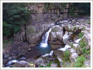 神仙谷 神仙谷為風美溪和比林溪交會的溪谷,原名死亡谷,早期為泰雅族祖先的墳場,谷地寬闊,由6、7層的岩階組成,溪水層層傾瀉而下形成多道奔騰的水瀑,瀑下的水潭清澄見底。 近年由参山國家風景區管理處再整修步道,並興建150公尺長的吊橋,連接對岸的石門步道,吊橋兩端都有寬敞的觀景台,橋頭以泰雅傳統圖騰為裝飾,由橋上眺覽,景觀又更為壯闊。 |